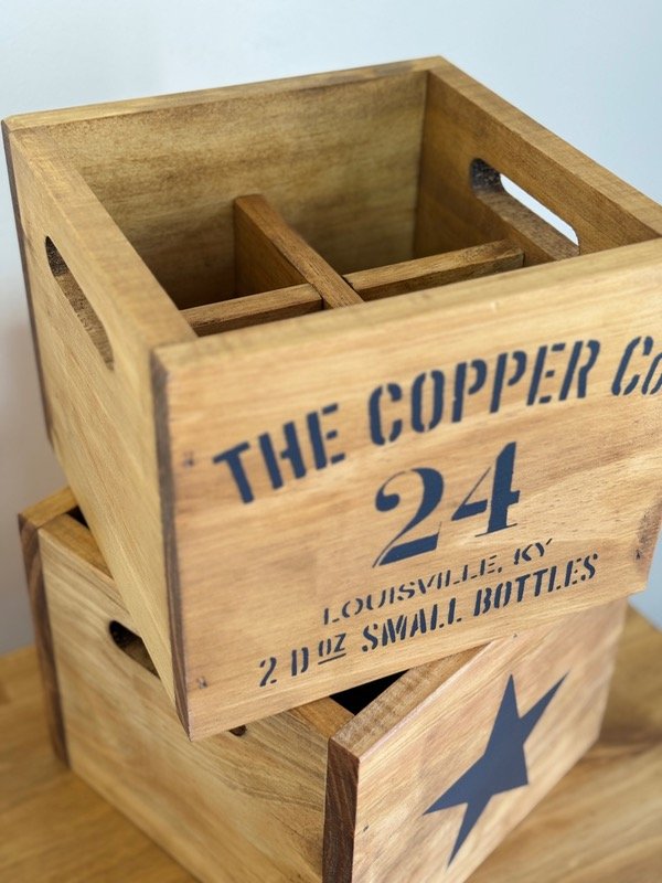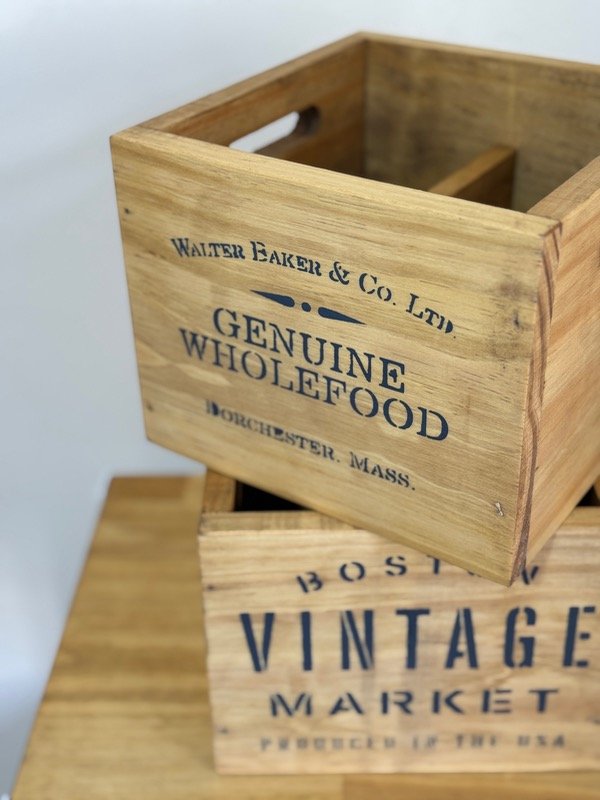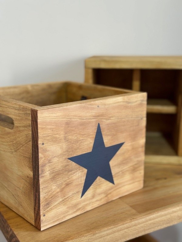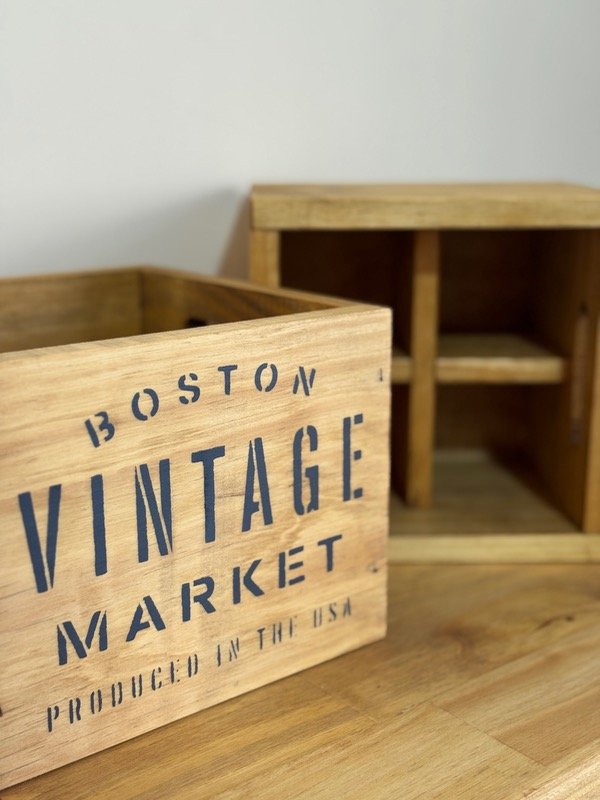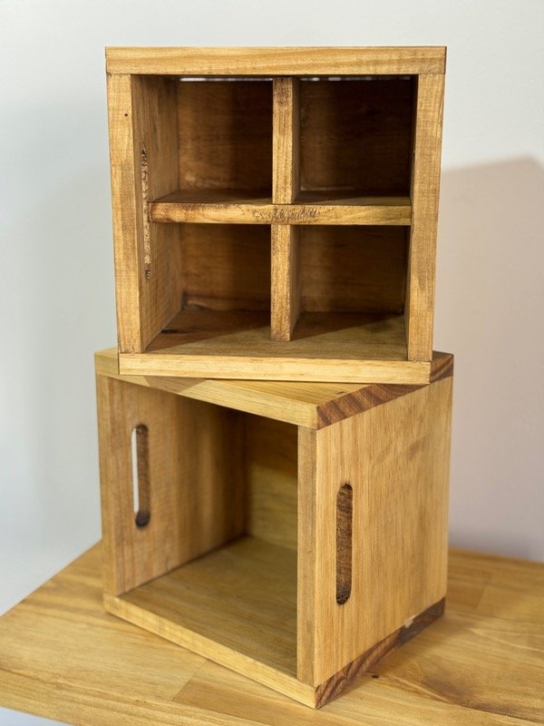Cajón de madera construido en pino seleccionado, teñido con tinte roble con estampa, CON SEPARADOR.