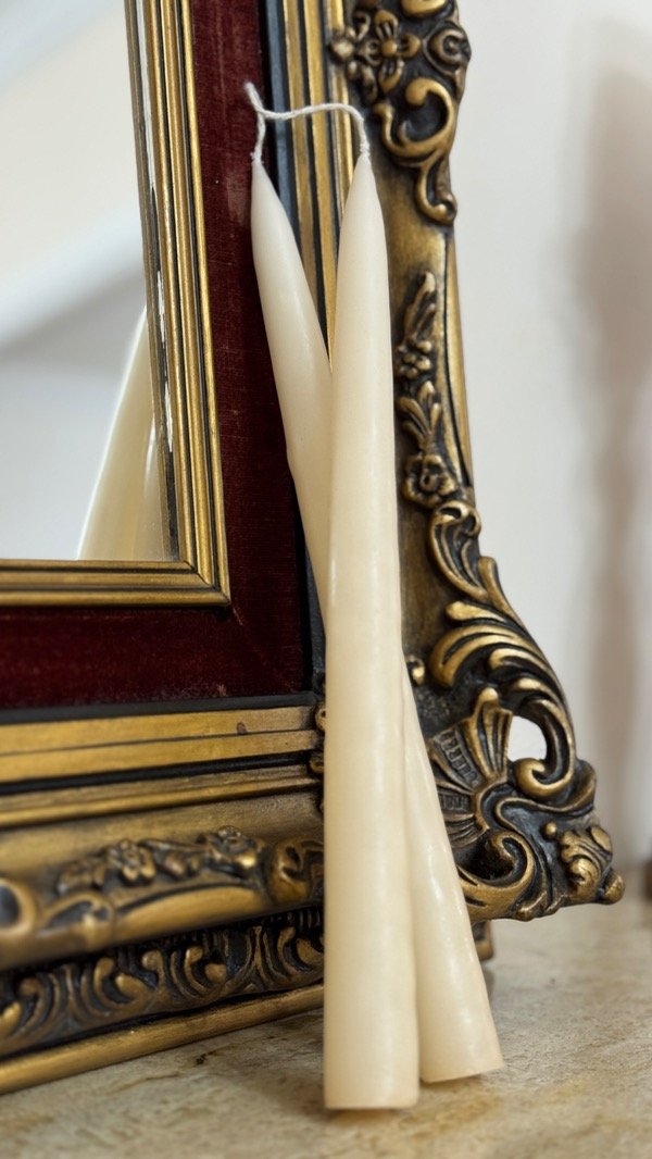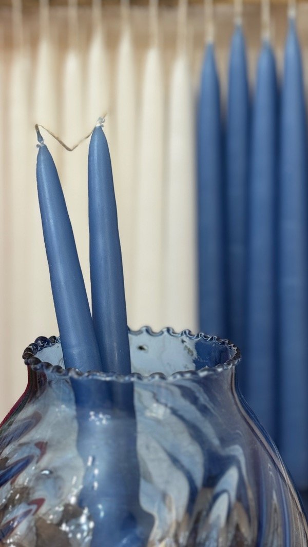 Realizadas con la antigua técnica de inmersión, lo que genera una forma cónica y una terminación satinada. El largo aproximado es de 24cm y el ancho de la base es de2 cm.